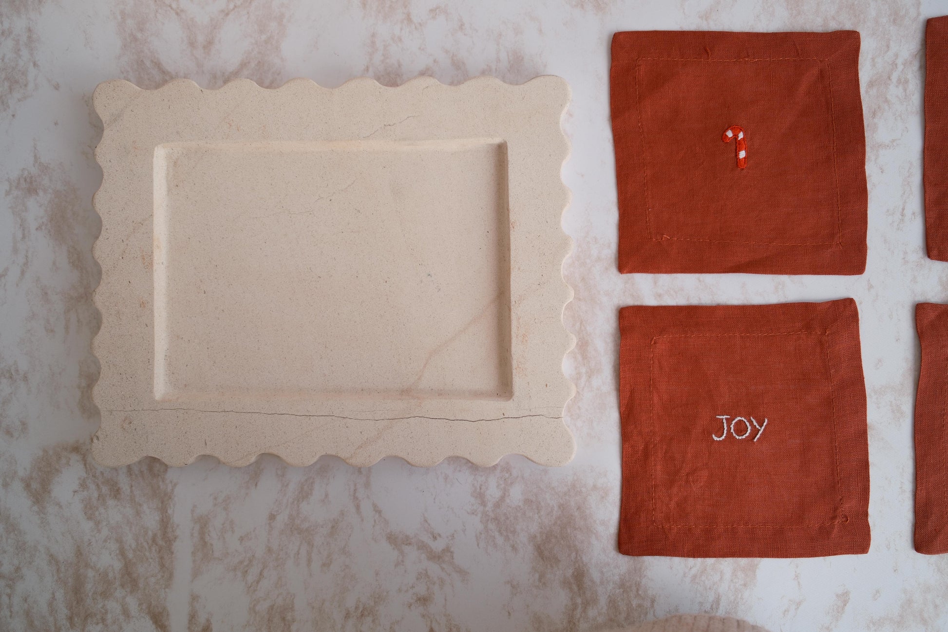 La bandeja de mármol aporta textura y presencia, mientras que las servilletas de lino 100% con bordados a mano suman un detalle delicado y atemporal.